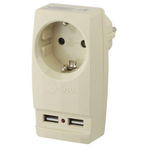Разветвитель электрический на 1 розетку + 2 USB с заземлением 16А, пластик, бежевый, IP20 от ЭРА (Энергия света), артикул б0027836, позволяет расширить возможности одной розетки, добавив два USB-порта для зарядки устройств без необходимости в адаптерах.