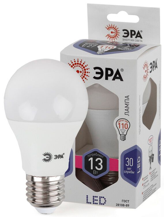 Лампа светодиодная A60-13W-860-E27 грушевидная 1040 лм от бренда ЭРА - экономичный заменитель обычных ламп накаливания для домашнего и офисного освещения. Подходит для люстр, потолочных и настольных светильников с цоколем E27.
