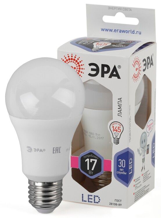 Лампа светодиодная A60-17W-860-E27 от ЭРА - экономичный заменитель обычной лампочки накаливания с мощным и равномерным световым потоком. Подходит для установки в люстры, потолочные, настольные и настенные светильники с цоколем E27. Матовое стекло и холодный белый свет обеспечивают комфортную видимость без лишней усталости глаз.