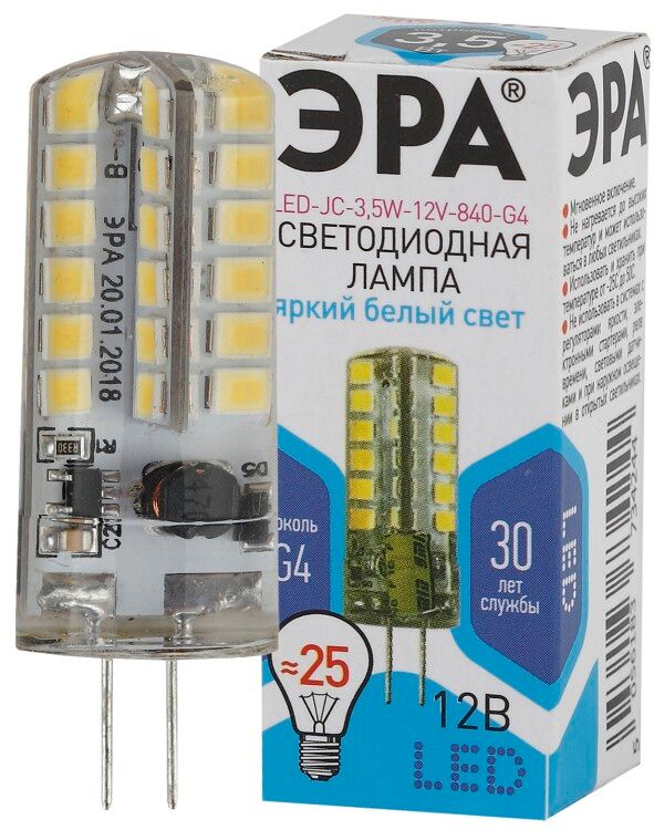 Лампа светодиодная 3,5 Вт 12 В 4000 К нейтральный свет G4 от ЭРА - компактный источник света с цоколем G4, предназначенный для замены галогенных ламп в точечных светильниках, бра и настольных лампах. Благодаря низкому потреблению энергии и длительному сроку службы, эта лампа обеспечивает надёжное и равномерное освещение в бытовых условиях.
