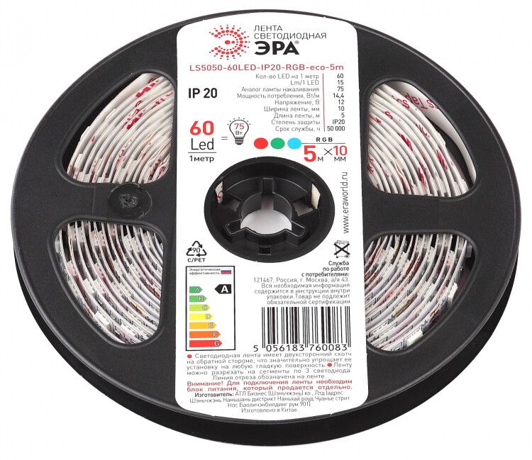 Лента светодиодная LS5050-60LED-IP20-RGB-eco-5m от ЭРА - универсальное решение для мягкого многоцветного освещения интерьеров. Благодаря самоклеющемуся основанию и компактным размерам её легко монтировать даже без специальных инструментов. Артикул б0035606 соответствует серии 49 Светодиодные ленты & светодиодные модули.