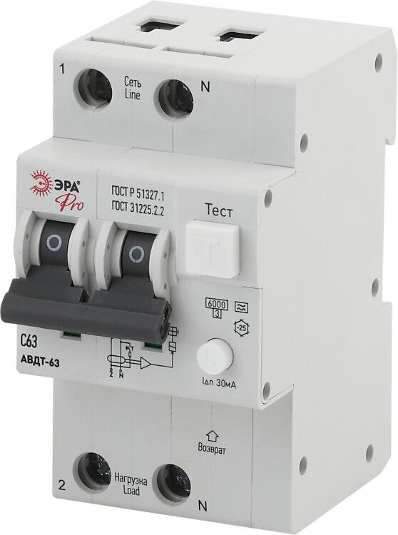 Автоматический выключатель дифференциального тока Pro NO-902-05 АВДТ 63 (А) C63 30mA 6кА 1P+N ЭРА - Б0031855