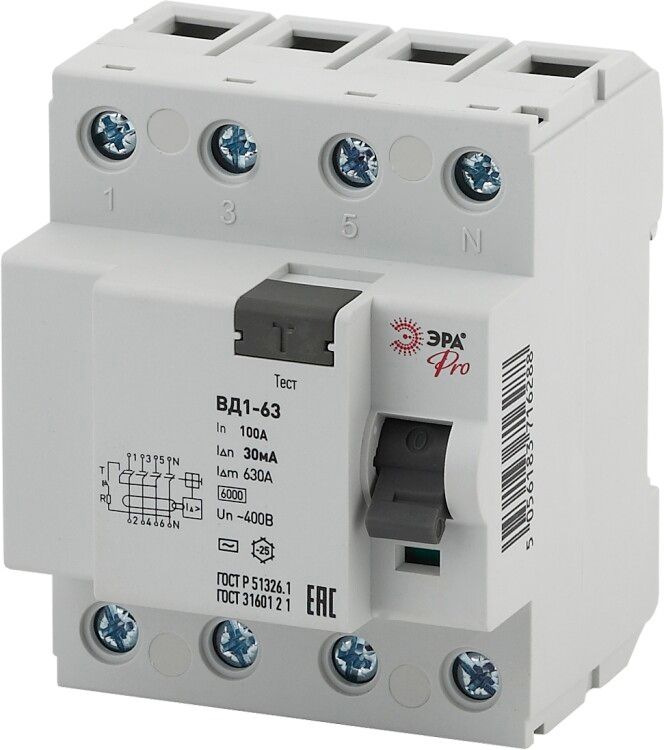 Устройство защитного отключения (УЗО) эл-механическое ВД1-63 3P+N/4P 100А 30мА от бренда ЭРА предназначено для защиты людей от поражения электрическим током и предотвращения пожаров из-за утечек тока. Это надёжное эл-механическое УЗО без собственного энергопотребления, подходящее для установки в распределительных щитах с DIN-рейкой.