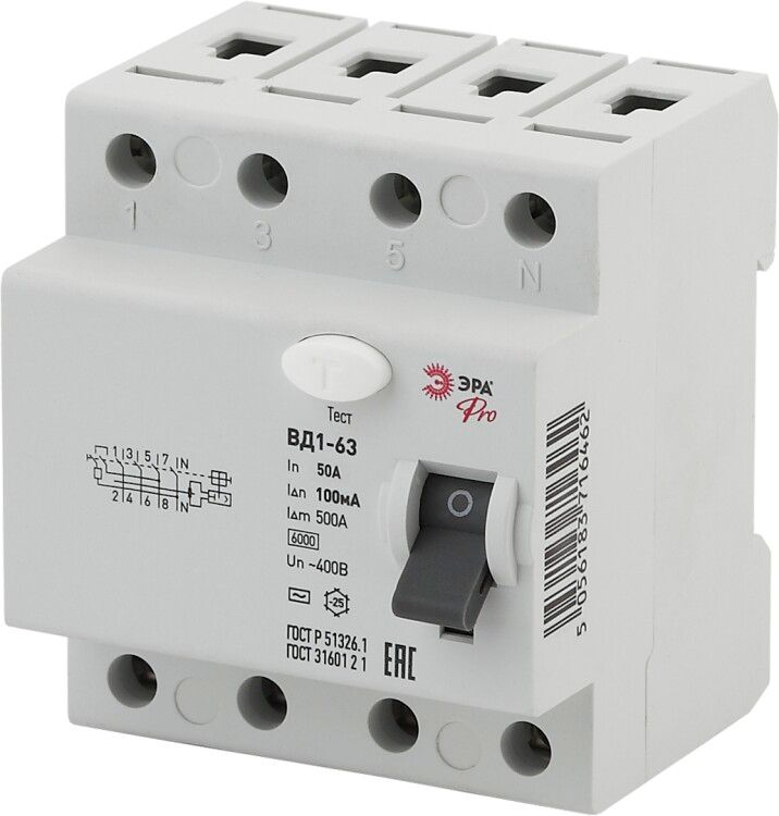 Выключатель дифференциального тока (УЗО) ВД1-63 3P+N/4P 50А 100мА NO-902-71 от бренда ЭРА предназначен для защиты людей от поражения электрическим током и предотвращения пожаров из-за утечек тока. Это электромеханическое устройство работает без внешнего питания и надёжно функционирует в промышленных и коммерческих сетях с напряжением до 400 В.
