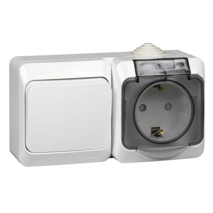 Блок комбинированный наружный с розеткой с заземлением и защитными шторками 16А 250В евростандарт и переключателем одноклавишным IP44 белый от Systeme Electric (артикул bpa16-246b) сочетает в себе выключатель и розетку в одном корпусе - идеальное решение для наружной установки в помещениях с повышенной влажностью, таких как ванные комнаты, балконы или хозпостройки.