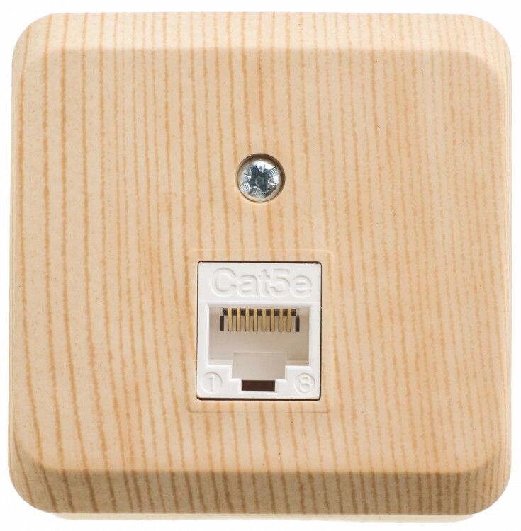 Розетка компьютерная открытой установки RJ45 категория 5E сосна SE используется для подключения сетевого оборудования - компьютеров, IP-камер, телефонов VoIP, принтеров, терминалов и других устройств с интерфейсом RJ45. Подходит для монтажа на стену в помещениях с нормальной влажностью: офисах, домашних рабочих зонах, учебных классах, серверных шкафах и на производстве. Благодаря защите IP20 и климатическому исполнению УХЛ4, её можно использовать в неотапливаемых помещениях с умеренным температурным режимом.