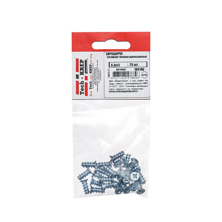Еврошуруп потайная головка оцинкованный 6.3х13 (25 шт) от Zitar, Tech-KREP и Тех-КРЕП - это надёжный крепёж для точного и прочного соединения тонкостенных древесных материалов в мебельном производстве.