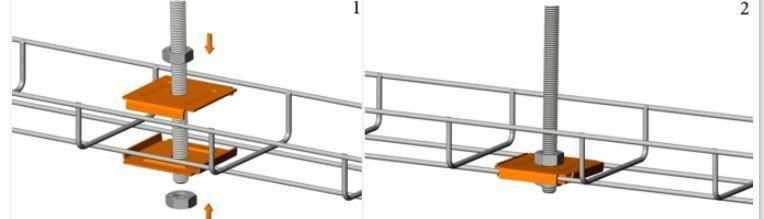 Фиксатор совместим со шпильками диаметром М6, М8 и М10. Устанавливается на нижнюю кромку проволочного лотка - накладка плотно охватывает боковые ребра основания. Для монтажа требуется лишь просверлить отверстие в стене или потолке, вставить шпильку, надеть фиксатор и затянуть гайку. Нет необходимости в сварке или специальных инструментах - достаточно обычного ключа.