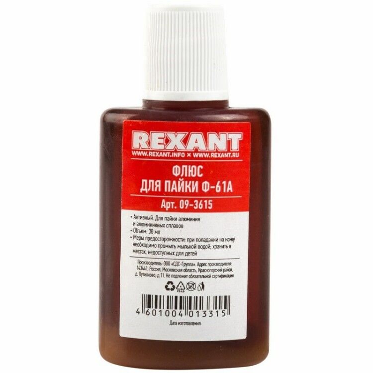 Флюс для пайки Ф-61А (пайка алюминия) 30 мл от REXANT - жидкий состав для удаления оксидных плёнок с алюминия, меди и стали перед пайкой оловянными и цинковыми припоями. Удобная упаковка 30 мл подходит для точечных работ и ремонта.