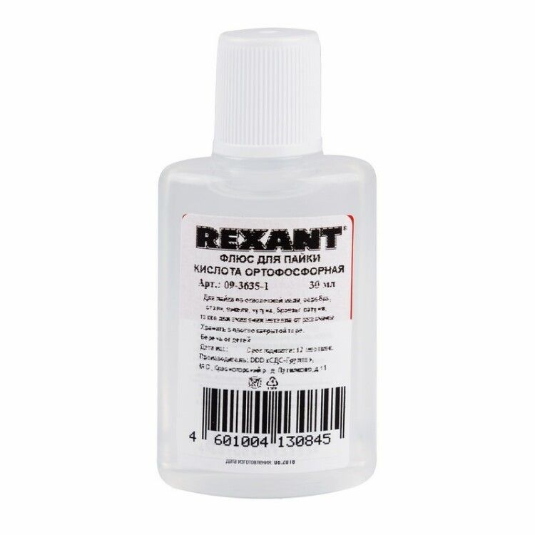 Флюс для пайки ЛТИ-120 от REXANT - жидкий состав с кисточкой в флаконе объемом 30 мл, предназначенный для подготовки поверхностей из цинка, меди, нихрома и других металлов перед пайкой. Артикул 09-3626-1 обеспечивает точную дозировку и удобство работы на печатных платах и чувствительной радиоэлектронике.