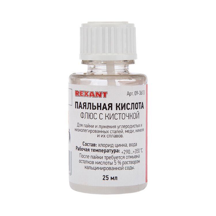 Флюс для пайки паяльная кислота 25 мл с кисточкой от REXANT - это жидкий кислотный флюс, предназначенный для подготовки поверхностей стали, меди и никеля перед пайкой. Благодаря встроенной кисточке и компактному флакону, продукт удобен для точечного нанесения даже в труднодоступных зонах.