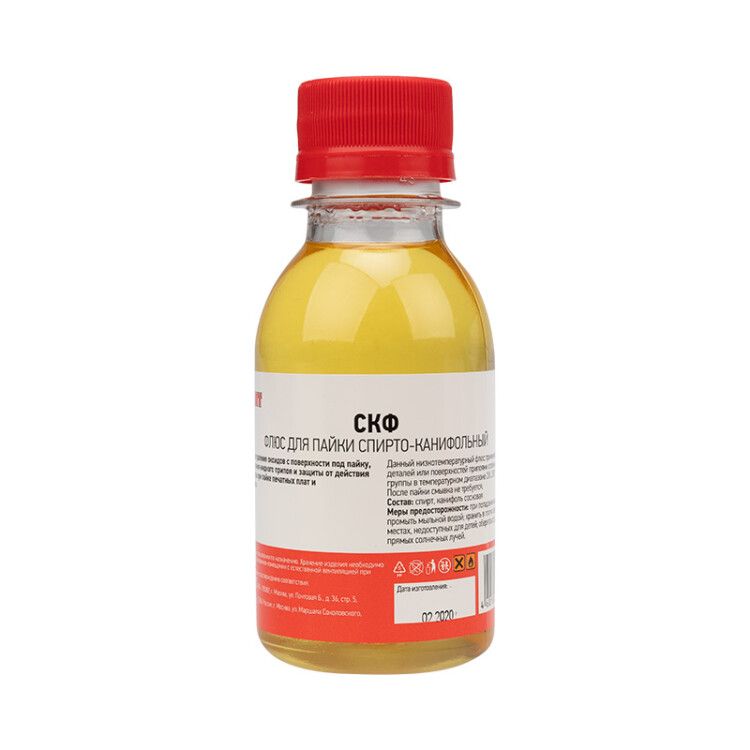 Флюс для пайки спирто-канифольный СКФ 100 мл флакон от REXANT - жидкий состав на основе канифоли и этилового спирта, предназначенный для подготовки поверхностей при пайке печатных плат и радиокомпонентов. Обеспечивает надёжное соединение за счёт удаления оксидов и улучшения растекания припоя, особенно эффективен при работе с медью и её сплавами.