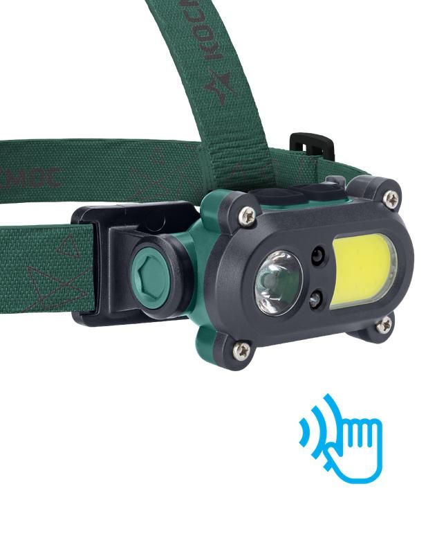 Фонарь аккумуляторный налобный сенсорный 3Вт LED+3Вт COB LED с коллиматорной линзой Li-ion 18650 1200мА.ч корпус ABS-пластик USB-шнур регулируемый эласт. ремешок КОСМОС KOC502Lit