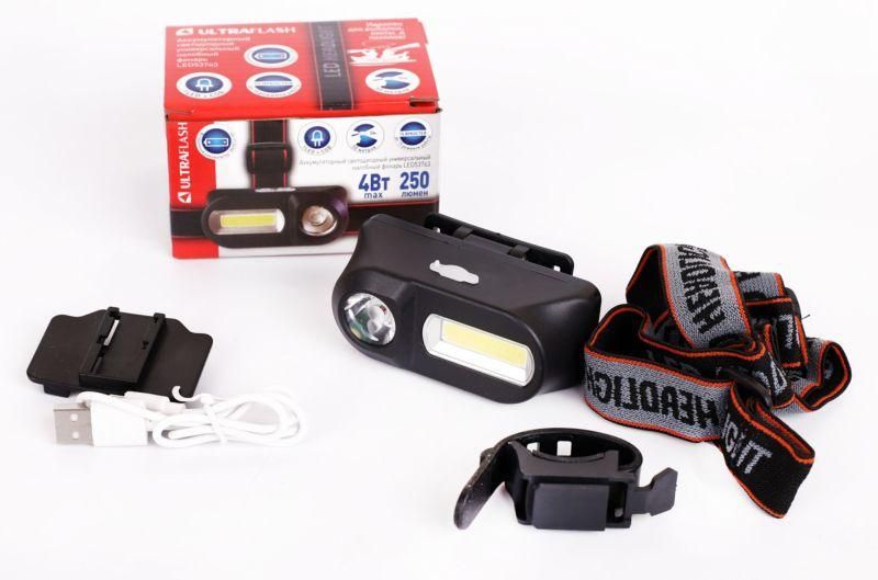 Фонарь аккумуляторный налобный LED53763 XPE + COB LED 3 3Вт 1 режим аккум 3.7В крепл. черн. (бокс) Ultraflash 14504