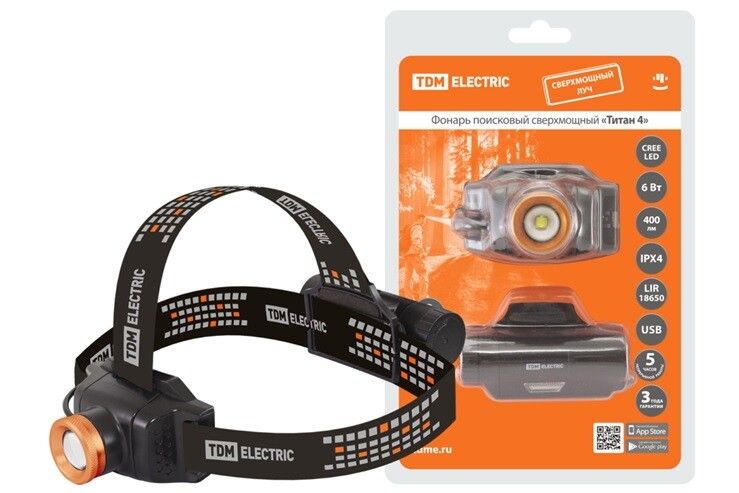 Фонарь налобный «Титан 4» 6 Вт 1 светодиод CREE 400 лм, 1х18650 3.7 В 2200 мА*ч, IPX4, USB, | SQ0350-0064 TDM