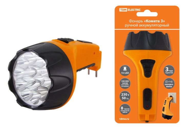 Фонарь универсальный «Комета 3» ручной аккумуляторный, 15 светодиодов, 1,1Ач 230В вилка | SQ0350-0041 TDM