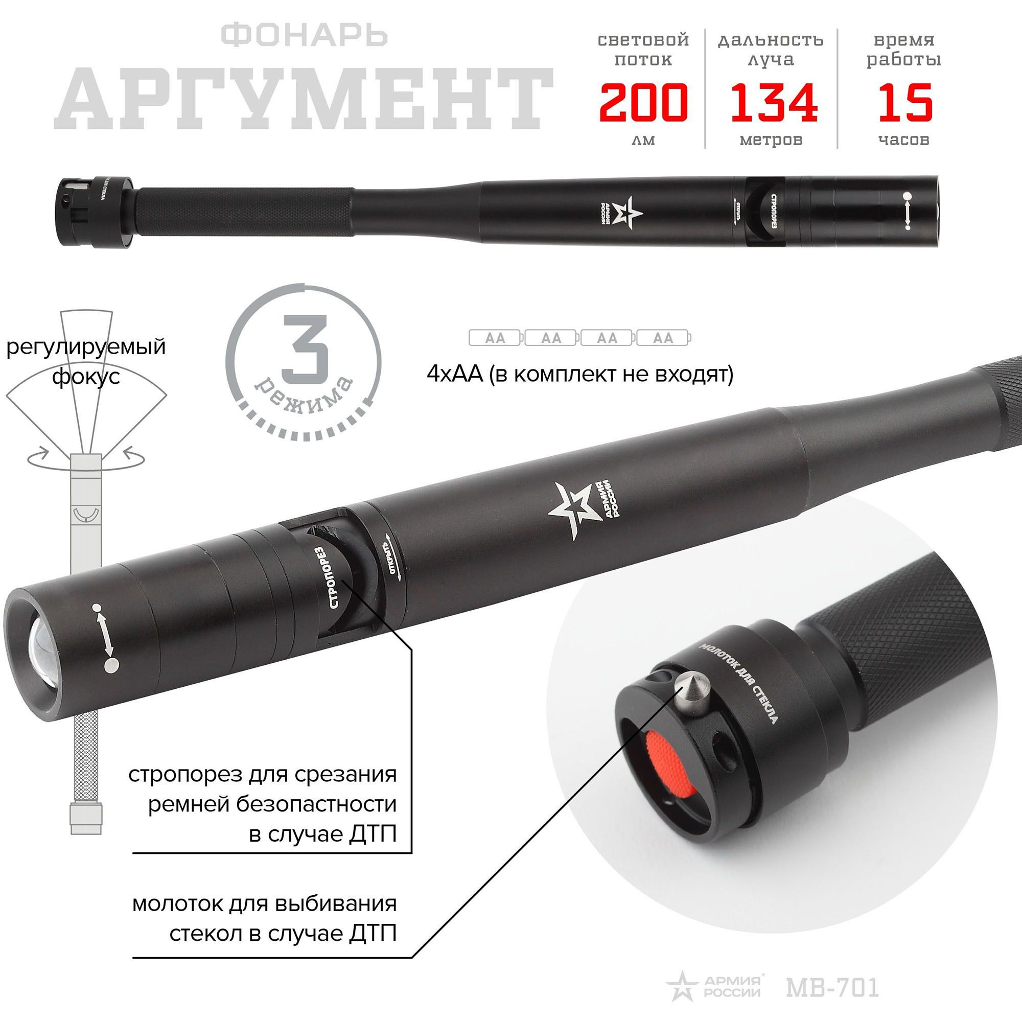 Фонарик бита на батарейках 4хАА, ударопрочный металлический корпус, регулируемый фокус, стропорез, автомобильный молоток, 3 режима MB-701 Аргумент Армия России - Б0030199 ЭРА