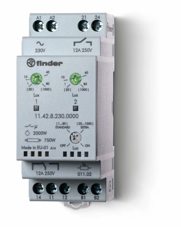 Фотореле Finder 11.42.8.230.0000 - модульное устройство для автоматического управления освещением на основе уровня окружающей освещённости. Устанавливается на DIN-рейку, имеет два независимых канала и подходит для систем уличного, внутреннего и промышленного освещения.