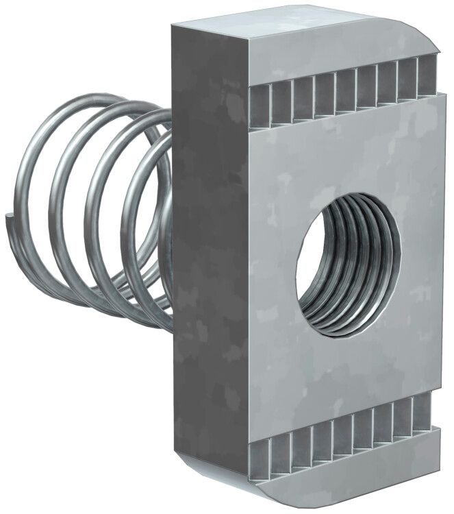 Гайка канальная с пружиной М12х40 используется для соединения элементов STRUT-системы друг с другом и для фиксации кабельных лотков к STRUT-консолям. Применяется там, где требуется быстрая установка и надёжное удержание при возможной вибрации - например, в системах кабельного монтажа, на производствах, в энергообъектах и телекоммуникационных шкафах.
