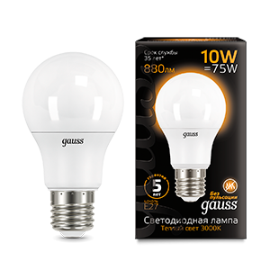 Лампа светодиодная 10 Вт A60 грушевидная 3000К теплый белый E27 880 лм 220В от GAUSS - замена лампе накаливания 150 Вт с равномерным мягким светом, подходит для бытовых и офисных светильников с цоколем E27. Артикул 102502110 обеспечивает долгую службу и точную цветопередачу.