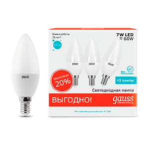 Лампа светодиодная LED 7 Вт 470 лм 4100К AC180-240В E14 свеча нейтральный (промоупаковка 3 лампы) Elementary Gauss - 33127T
