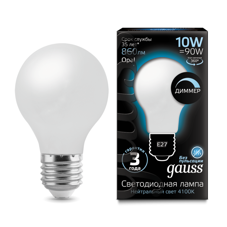 Лампа светодиодная 10Вт E27 220В 4100К A60, диммируемая от GAUSS - это энергоэффективный источник света с возможностью плавной регулировки яркости, подходящий для замены традиционных ламп в жилых и офисных помещениях. Артикул 102202210-d сочетает высокую цветопередачу, долгий срок службы и совместимость с большинством диммеров.