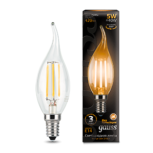 Лампа светодиодная филаментная 5 Вт 420 лм 2700К теплый белый свеча на ветру E14 220В прозрачная колба от GAUSS - это энергоэффективная замена классическим лампам накаливания с естественным 360°-свечением и эстетикой старинного стеклянного баллона. Подходит для декоративного и функционального освещения в жилых и офисных помещениях.