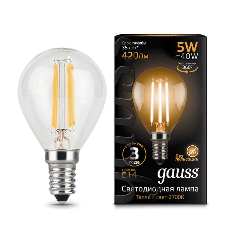 Лампа светодиодная филаментная LED 5 Вт 420 лм 2700К AC185-265В E14 шар P45 теплая Black Filament Gauss - 105801105 представляет собой новейшую технологию в светотехнике. Она сочетает в себе преимущества классических ламп накаливания и энергоэффективности светодиодных ламп.