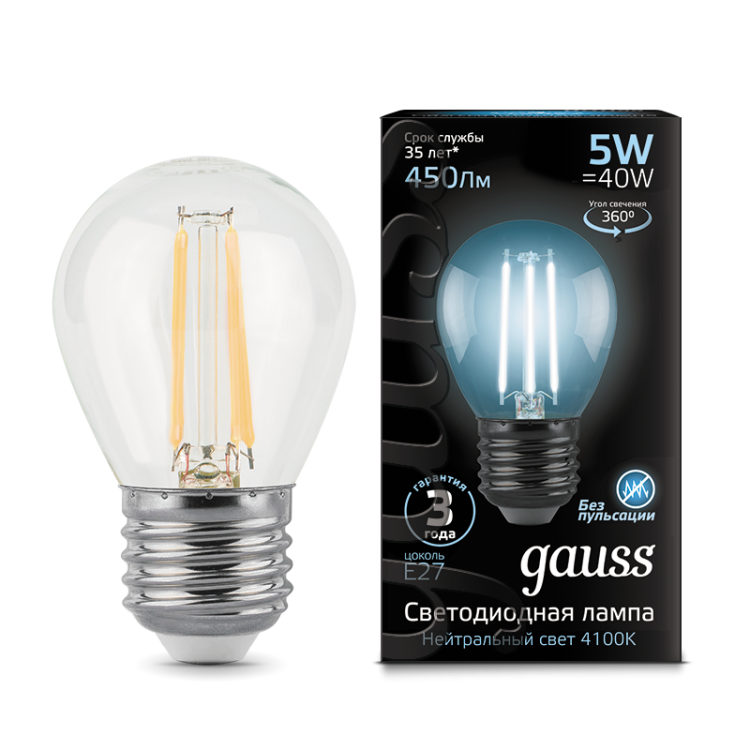 Лампа светодиодная 5Вт E27 220В 4100К шар филаментная, P45, нейтральный белый, 450лм от GAUSS сочетает внешний вид классической лампы накаливания с современной LED-технологией. Подходит для замены традиционных ламп в бытовых и офисных светильниках, особенно там, где важна эстетика открытой колбы.