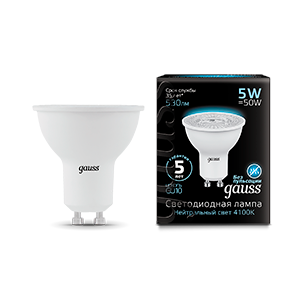 Лампа светодиодная GAUSS 101506205 - компактный источник света мощностью 5 Вт с цветовой температурой 4100 К и световым потоком 530 лм, предназначенный для замены галогенных ламп в точечных светильниках. Подходит для встроенных решений в интерьере и наружного освещения с ограниченными габаритами.