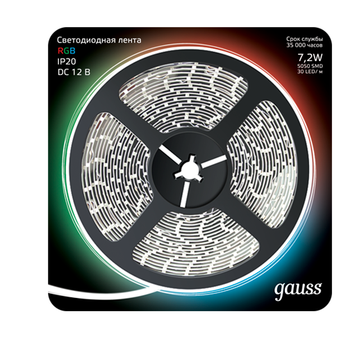 Лента светодиодная 5050/30-SMD 7.2 Вт/м 330 лм/м RGB DC 12В IP20 - гибкая самоклеящаяся лента с регулируемой цветовой температурой, предназначенная для декоративного и функционального освещения интерьеров. Бренд GAUSS обеспечивает надежную сборку и соответствие заявленным параметрам, артикул 312000407 соответствует блистерной упаковке длиной 5 метров.