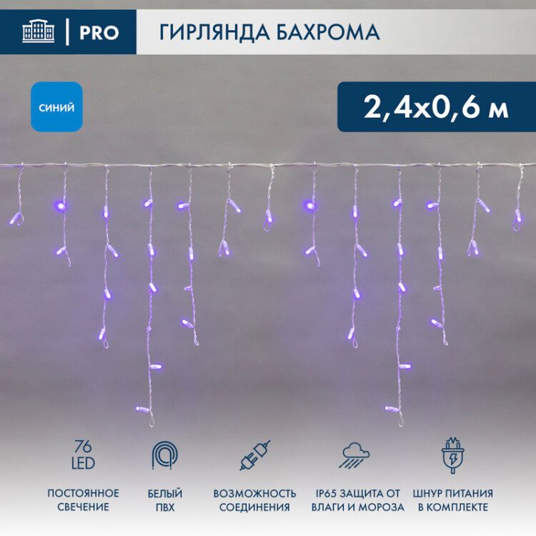 Гирлянда светодиодная Айсикл (бахрома) 2.4 х 0.6 м, 76 LED, диоды синие, 230 В, провод белый, IP65, NEON-NIGHT - это декоративная осветительная система с имитацией сосулек, предназначенная для наружного и внутреннего оформления фасадов, карнизов и витрин. Модель выполнена в исполнении бахрома, использует 76 синих светодиодов, питается от сети 230 В и соответствует классу защиты IP65. Артикулы: 255-033-6, etm255-033-6.