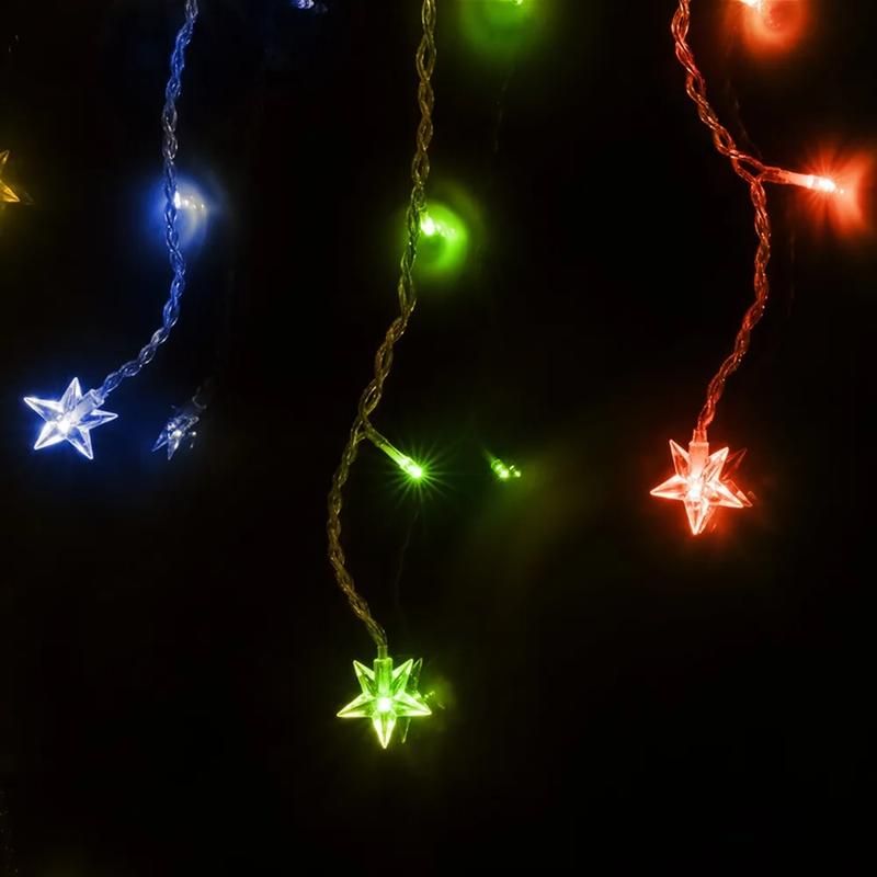 Гирлянда бахрома светодиодная 100 LED подключается напрямую к бытовой розетке 220 В. Для установки достаточно закрепить её верхнюю часть на стене, раме окна или потолке с помощью двустороннего скотча, крючков или хомутов. Нити свободно свисают - никаких дополнительных креплений не требуется. Шнур питания имеет длину 1,5 м, что позволяет расположить источник питания вне поля зрения.