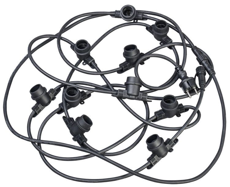 Гирлянда белт-лайт 3 метра 10 патронов E27 без ламп IP65 черный шнур 2 метра 230В транзит имеет два типа подключений: входной шнур 2 м для подключения к сети 230 В и выходной контакт на конце - для подсоединения следующей гирлянды. Это позволяет создавать длинные линии освещения без дополнительных распределительных коробок. Монтаж выполняется на поверхности с помощью хомутов, крепёжных планок или специальных креплений. Установка допускается на деревянные, металлические и бетонные конструкции. Лампы должны соответствовать максимальной нагрузке на каждый патрон - рекомендованная мощность до 100 Вт на лампу (суммарно до 1000 Вт на всю гирлянду).