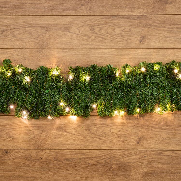 Еловый шлейф искусственный 2,7 м 80 LED теплое белое свечение 3,6 Вт 220 В IP44 предназначен для декоративного освещения внутри помещений и в защищённых наружных зонах. Подходит для украшения дверных проёмов, арок, перил, веранд, торшеров, стен и полов. Используется в жилых домах, офисах, кафе и торговых центрах во время праздников - особенно эффективен в рождественском и новогоднем оформлении.