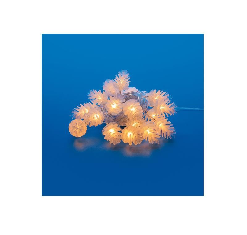 Гирлянда светодиодная 'Шишки' 5 метров, 50 светодиодов, теплый белый свет, провод прозрачный, IP20 используется исключительно внутри помещений. Подходит для украшения новогодних и праздничных интерьеров: елок, окон, каминов, потолков, лестниц, фоторамок и других элементов декора. Не предназначена для наружного использования или мест с повышенной влажностью.