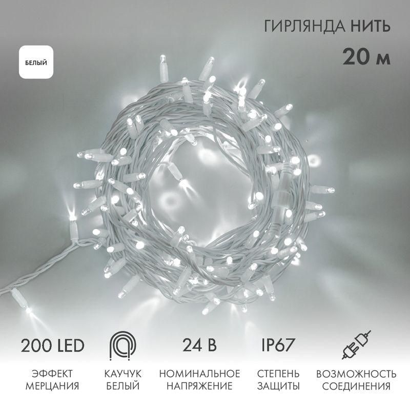 Гирлянда светодиодная "Нить" 20м 200LED бел. 15Вт 24В IP67 эффект мерцания (каждый 5-ый диод) провод каучук (нужен трансформатор 531-100/531-311/531-312) Neon-Night 315-535