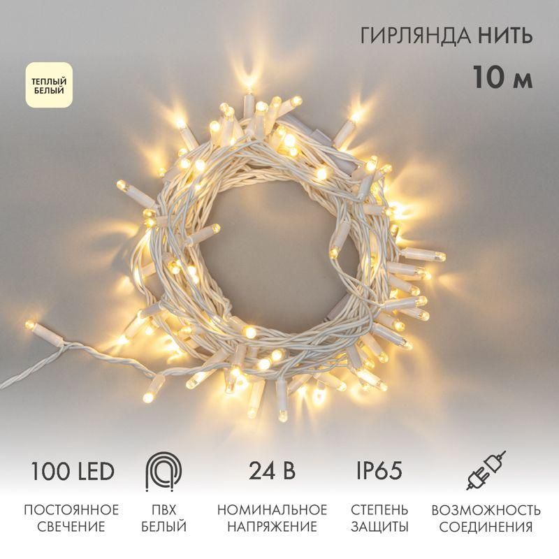 Гирлянда светодиодная Нить 10 м, 100 LED, тёплый белый, постоянное свечение, 24 В, провод ПВХ белый, IP65 - это энергоэффективный осветительный элемент на базе светодиодов, рассчитанный на длительную работу в условиях повышенной влажности и перепадов температур. Бренд Neon-Night предлагает эту модель как часть серии Home для декоративного освещения интерьеров и фасадов. Артикул 305-136 обеспечивает совместимость с трансформаторами серии 531-100/311/312.