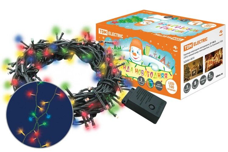 Гирлянда новогодняя светодиодная, СГ 100 З, 220 В, зеленый шнур, многоцветная, 5 м, 8 режимов | SQ0361-0010 TDM ELECTRIC