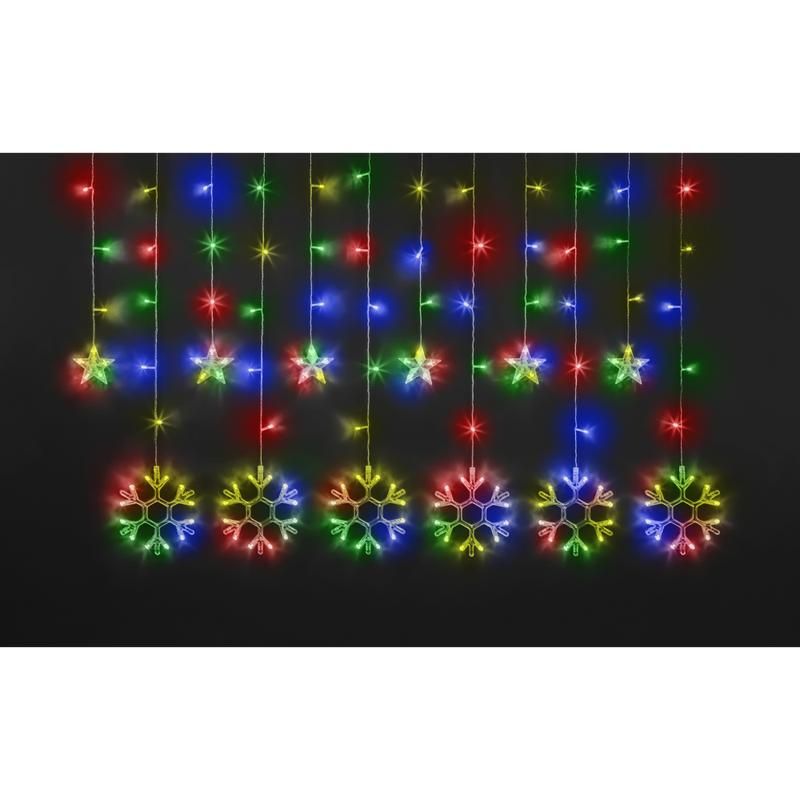 Эта гирлянда используется исключительно для внутреннего декора. Её форма - бахрома из звёзд и снежинок - создаёт эффект мерцающего узора на стене, потолке или окне. Подходит для оформления праздничных мероприятий, торговых точек, детских комнат и офисных пространств. Не предназначена для уличного использования из-за низкой степени защиты IP20.