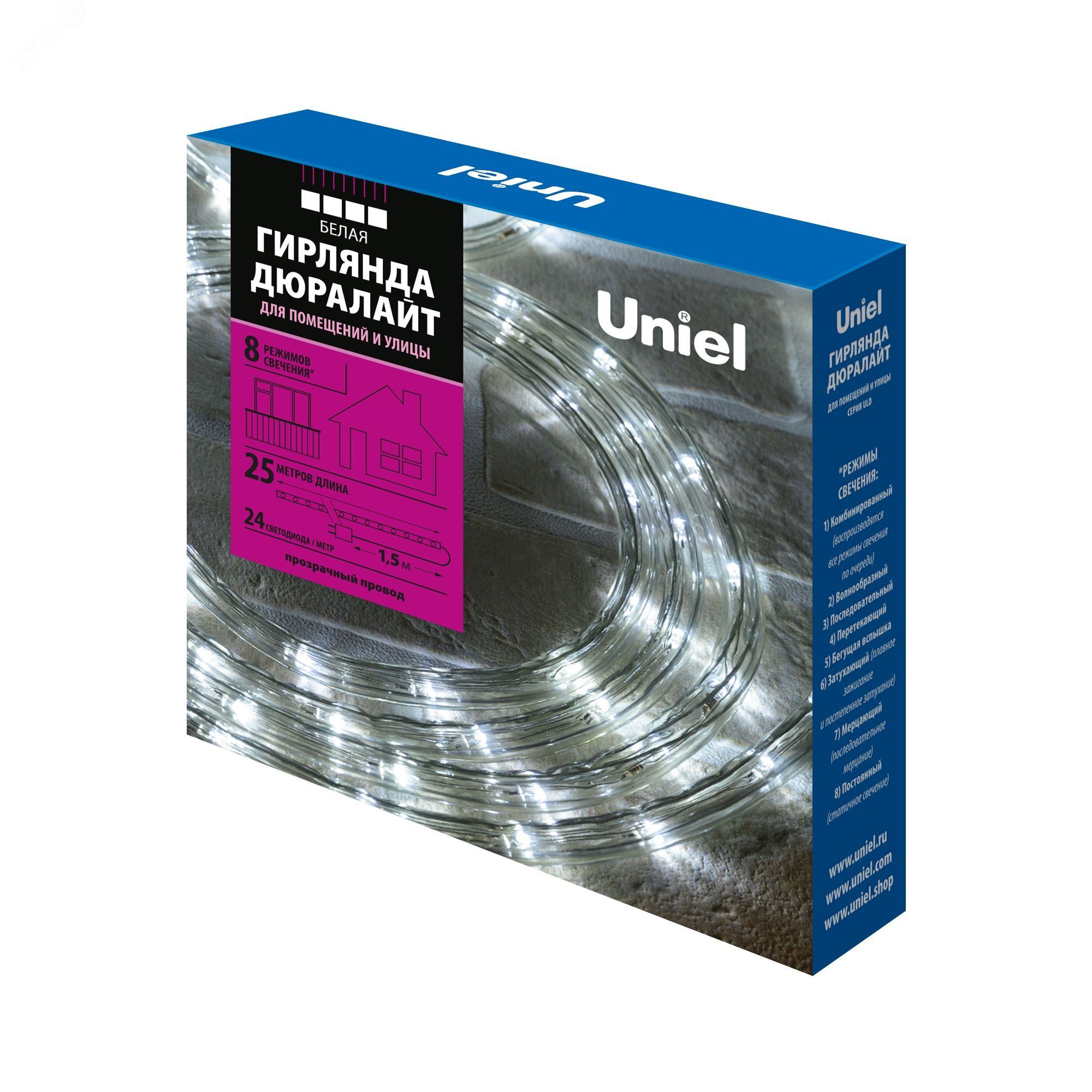 Гирлянда светодиодная ULD-D50 25M/С08 IP44 WHITE Дюралайт 25м с контроллером бел. свет провод Uniel UL-00008576