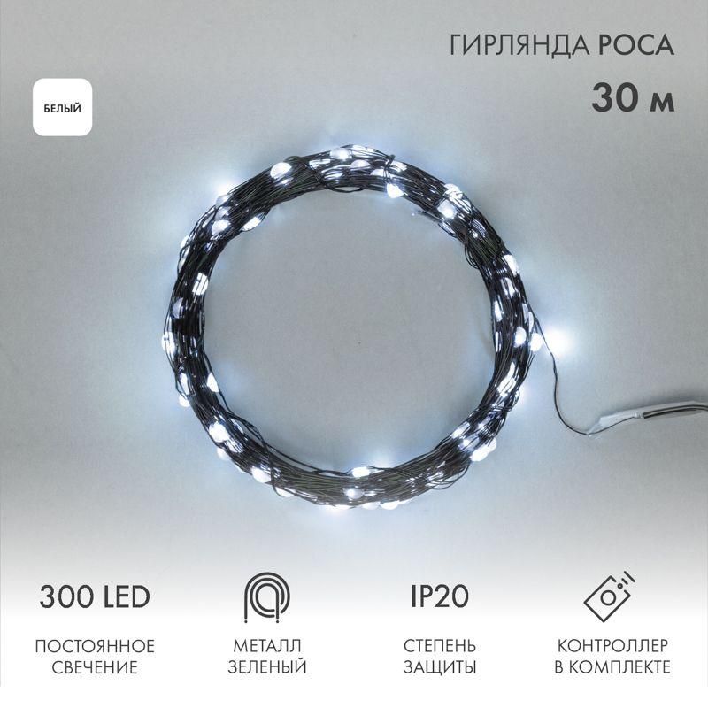 Гирлянда светодиодная "Роса" 30м 300LED бел. IP20 230В с контроллером провод зел. Neon-Night 303-275