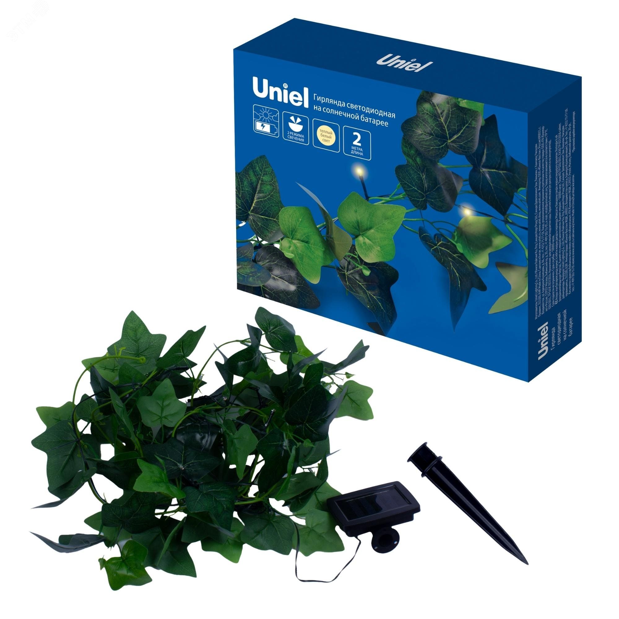 Садовая гирлянда Uniel USL-S-135/PT2000 IVY - это автономное освещение на солнечной батарее с 20 светодиодами тёплого белого света, предназначенное для декоративной подсветки участка без подключения к сети. Гирлянда легко монтируется, работает за счёт накопленной энергии и подходит для установки в саду, на террасе или возле беседки.