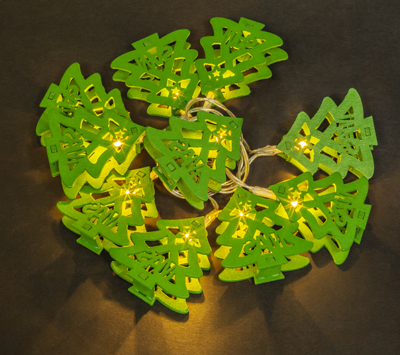 - Количество светящихся элементов: 10 деревянных ёлочек