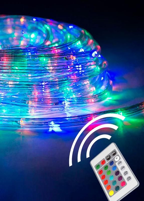 Гирлянда светодиодная влагозащитная Дюралайт 10м (нить в трубе 0.8мм) + 30 клипс, USB 5В, пульт дистанционного управления, мультиколор от бренда КОСМОС (артикул koc_gir-u101) предназначена для декоративной подсветки интерьеров. Гибкая трубчатая конструкция позволяет легко формировать любые контуры, а управление через пульт делает её удобной для домашнего использования.