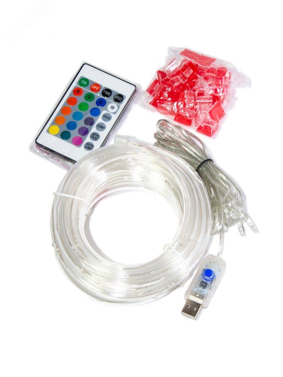 Гирлянда влагозащитная 10м (нить 0,8мм) с клипсами, декоративная с пультом управления от бренда КОСМОС, артикул koc_gir-b103 - это гибкая LED-лента в виде тонкой трубочки с 100 светодиодами, предназначенная для внутреннего декоративного освещения. Управление цветом и эффектами осуществляется через пульт, питание - от трёх батареек AA.