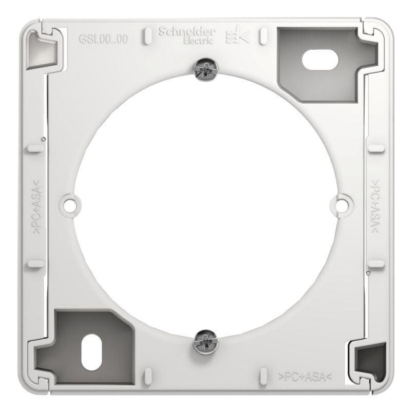 Коробка для наружного монтажа белая SE совместима со всеми стандартными модулями системы GLOSSA и аналогичными устройствами скрытого монтажа с посадочным размером 58,5 мм. Монтаж выполняется настенно-потолочно с помощью саморезов через крепёжные отверстия в задней части корпуса. Для ввода кабелей необходимо просверлить отверстия самостоятельно - рекомендуется использовать сверло диаметром 10–12 мм. Крышка фиксируется защелками - её можно открывать без инструментов для обслуживания.