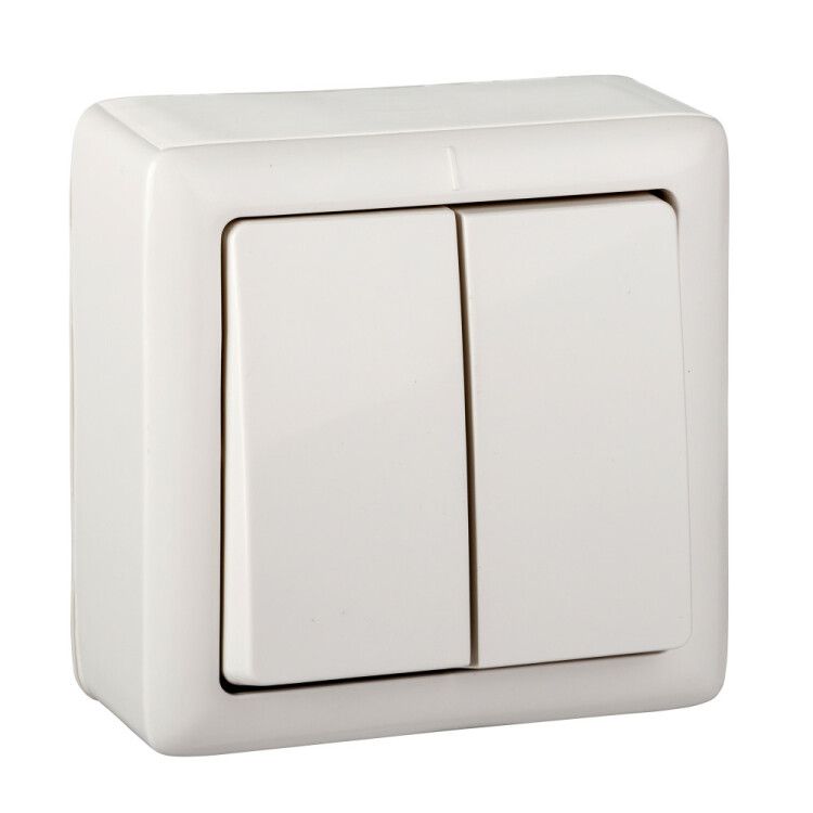 Выключатель наружный двухклавишный 6А 250В с изолирующей пластиной белый предназначен для коммутации цепей освещения в жилых, офисных и производственных помещениях. Он позволяет включать и выключать два независимых источника света - например, потолочные светильники, бра или подсветку - с одного места. Подходит для установки в коридорах, лестницах, санузлах, мастерских и других местах, где требуется управление несколькими группами освещения. Устройство рассчитано на работу в условиях, соответствующих климатическому исполнению УХЛ4.