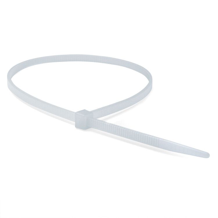 Хомут стандартный, белый, 4,8x360, полиамид 6.6 совместим со всеми типами кабелей, трубок и жгутов, имеющих диаметр до 100 мм. Для установки достаточно продеть свободный конец ленты через замок и затянуть до нужного уровня натяжения - механизм самоблокировки предотвращает случайное ослабление. Не требует инструментов. При монтаже в холодную погоду (ближе к –20 C) рекомендуется нагревать материал до комнатной температуры, чтобы избежать хрупкости.