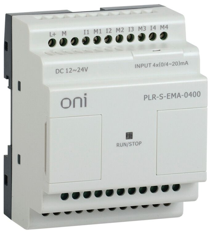 Реле логическое PLR-S 4AI серии ONI - модуль расширения с четырьмя аналоговыми входами, предназначенный для работы в составе контроллеров ONI PLR-S. Увеличивает количество доступных сигналов 0/4–20 мА, обеспечивая гибкую интеграцию датчиков давления, уровня, температуры и других аналоговых устройств в систему автоматизации на DIN-рейке.